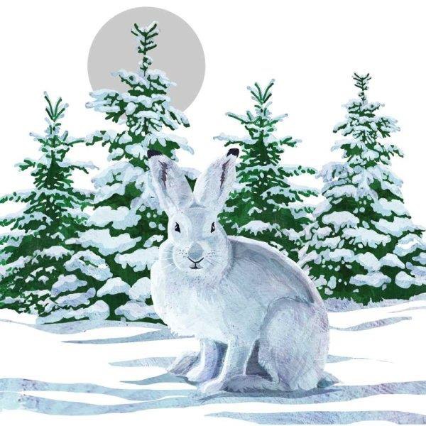 -Посмотрите, сколько снега вокруг! А вот и наш зайчонок! Как весело ему на снежной полянке!